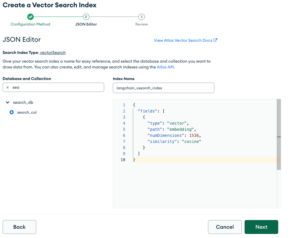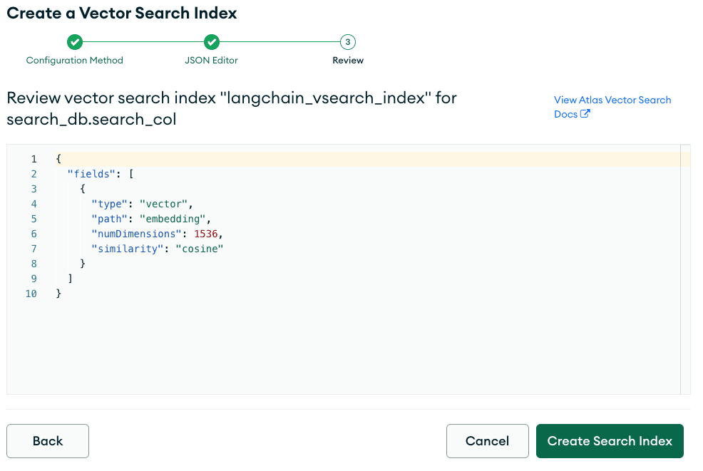 # Connect to your cluster client = MongoClient(MONGODB_URI) collection = client["langchain_db"]["test"] # Create your vector search index model, then create the index search_index_model = SearchIndexModel( definition={ "fields": [ { "type": "vector", "path": "embedding", "numDimensions": 1024, "similarity": "cosine" }, { "type": "filter", "path": "page_label" } ] }, name="vector_index", type="vectorSearch" ) collection.create_search_index(model=search_index_model)