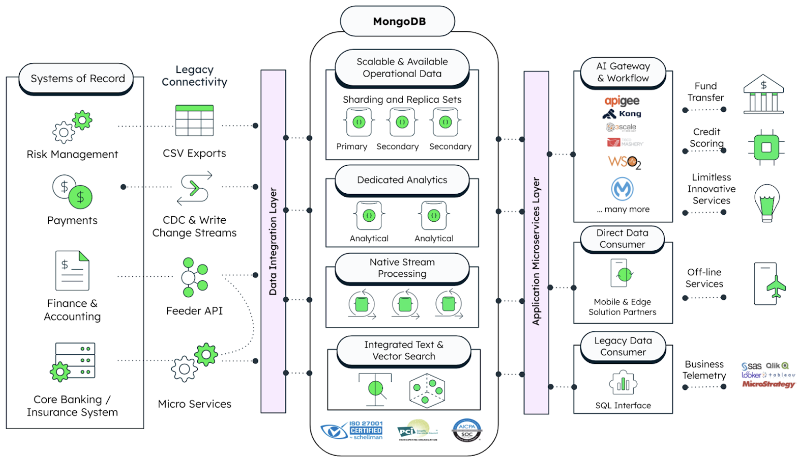 That's where MongoDB comes into play. MongoDB is purpose-built to deliver exceptional performance with its WiredTiger storage engine and compression capabilities. Additionally, MongoDB Atlas improves performance by following its intelligent index and schema suggestions, automatic data tiering, and workload isolation for analytics. One prime illustration of its capabilities is demonstrated by Temenos, a renowned financial services application provider, achieving remarkable transaction volume processing performance and efficiency by leveraging MongoDB Atlas. They recently ran a benchmark with MongoDB Atlas and Microsoft Azure and successfully processed an astounding 200 million embedded finance loans and 100 million retail accounts at a record-breaking 150,000 transactions per second. This showcases the power and scalability of MongoDB with unparalleled performance to empower financial institutions to effectively tackle the challenges posed by open banking. MongoDB ensures outstanding performance, scalability, and availability to meet the ever-evolving demands of the industry.
