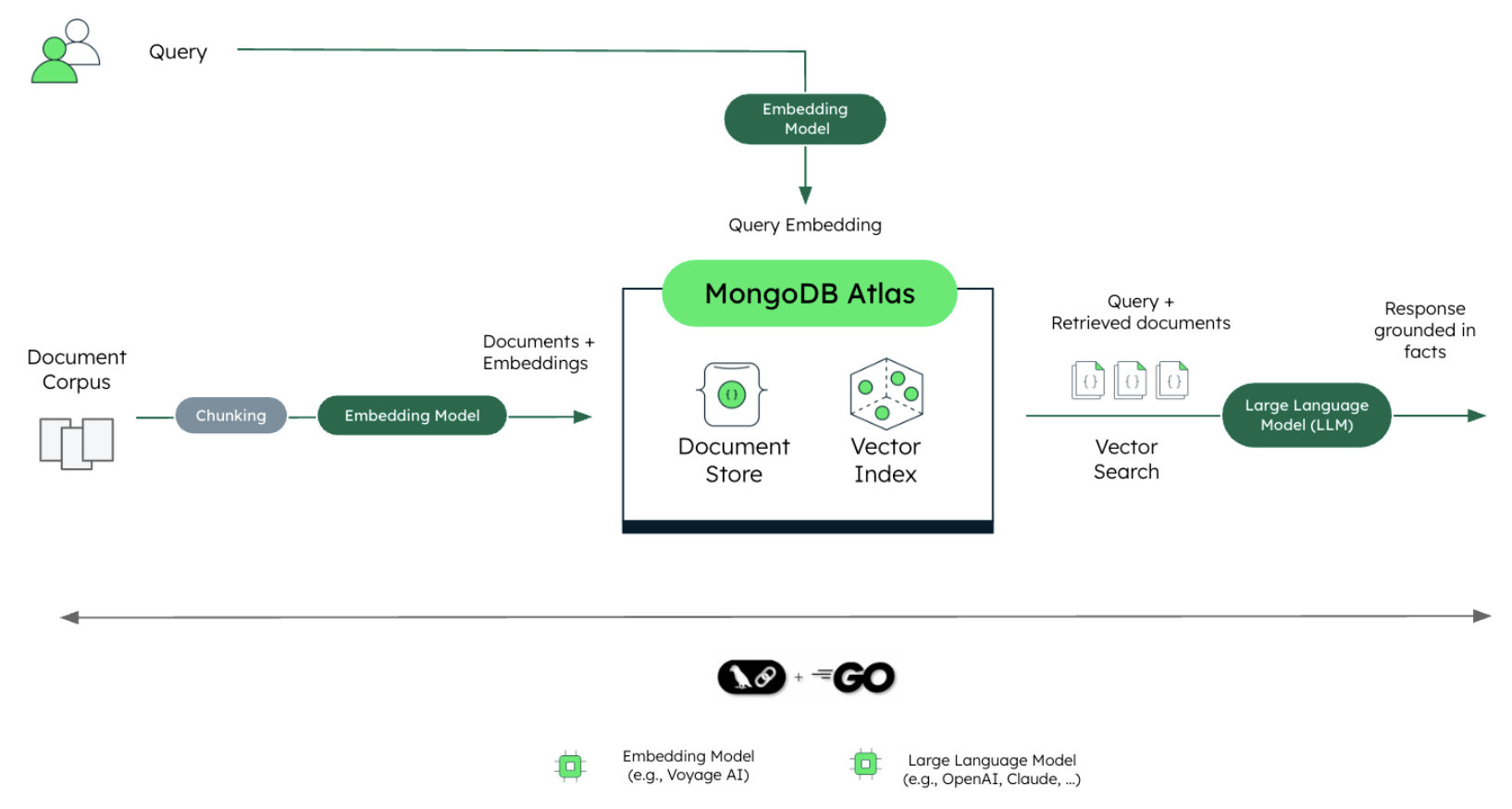 MongoDB is excited to announce our integration with LangChainGo, making it easier to build Go applications powered by large language models (LLMs). This integration streamlines LLM-based application development by leveraging LangChainGo’s abstractions to simplify LLM orchestration, MongoDB’s vector database capabilities, and Go’s strengths as a performant, scalable, and easy-to-use production-ready language.