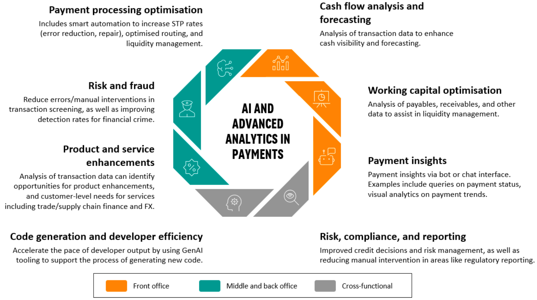 AI technologies are used today to address a wide range of different workflows and customer-facing services from process automation and optimization in the middle and back office, to areas such as real-time risk and liquidity management, cashflow forecasting, and service personalization in the front office. Virtual assistants and bots have also become an important part of the customer support process.