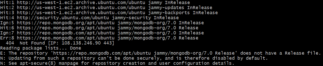E: The repository 'https://repo.mongodb.com/apt/ubuntu jammy/mongodb-org/7.0 Release' does not have a Release file.