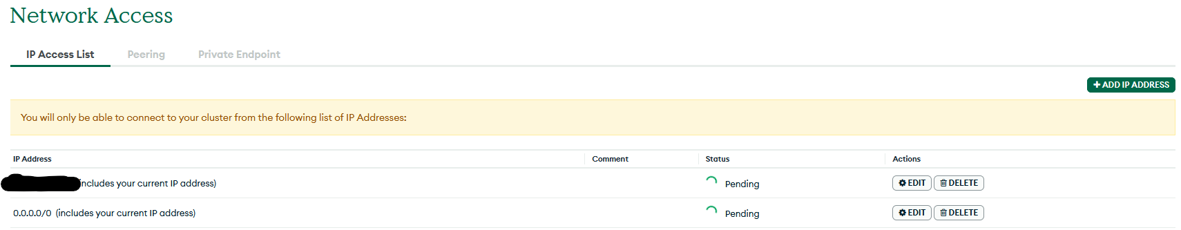 I am trying to connect to my DB through MongoDB Compass. This was working as of last night. I came home after work and restarted my PC, and tried to add my IP address to my MongoDB account through the management thing when you login, and it got stuck on pending for about 10 minutes. So I cleared out all my IP addresses that were saved (probably best practice tbh anyway) and then tried to re-add my existing, and it were stuck on Pending in the Network Management panel. Then I added the “connect from anywhere” option (0.0.0.0/0) and the same result. This has been about 30 minutes, I have tried clearing my browser history etc, logging in and relogging in, re-installed compass, re-done the connection string, tried about everything I can think of. Picture of what I am talking about below.