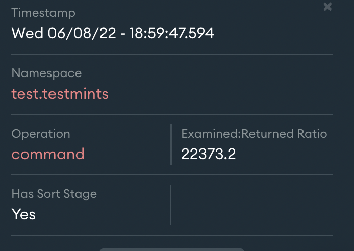 In the View More Details page, you will see some JSON with more information about the slow operation. In this JSON, I typically like to focus in on a few fields.