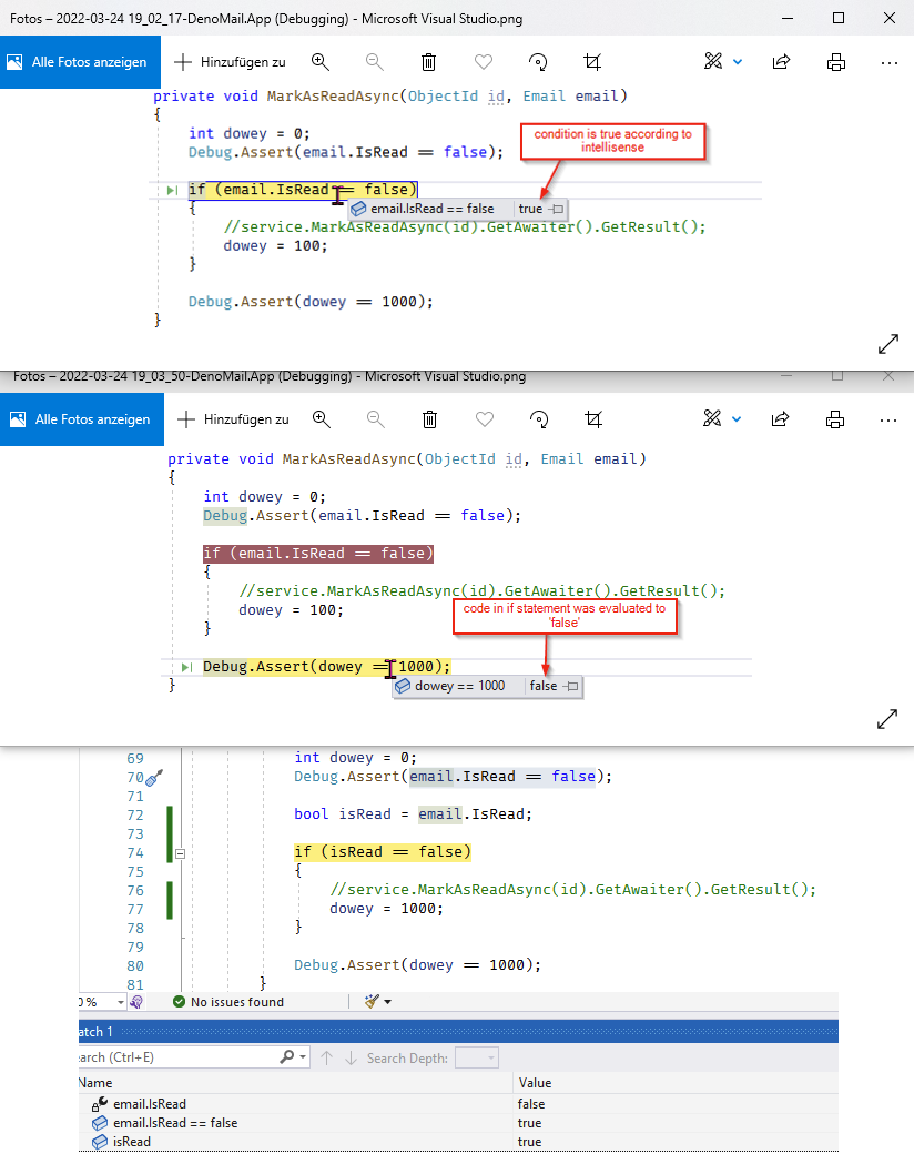 The second screenshot where dowey == 1000 is evaluated as false, you have dowey = 100 (one less zero) in the if case. That seems fixed in the 3rd screenshot, but it’s not clear whether the debugger evaluates dowey == 1000 to false.