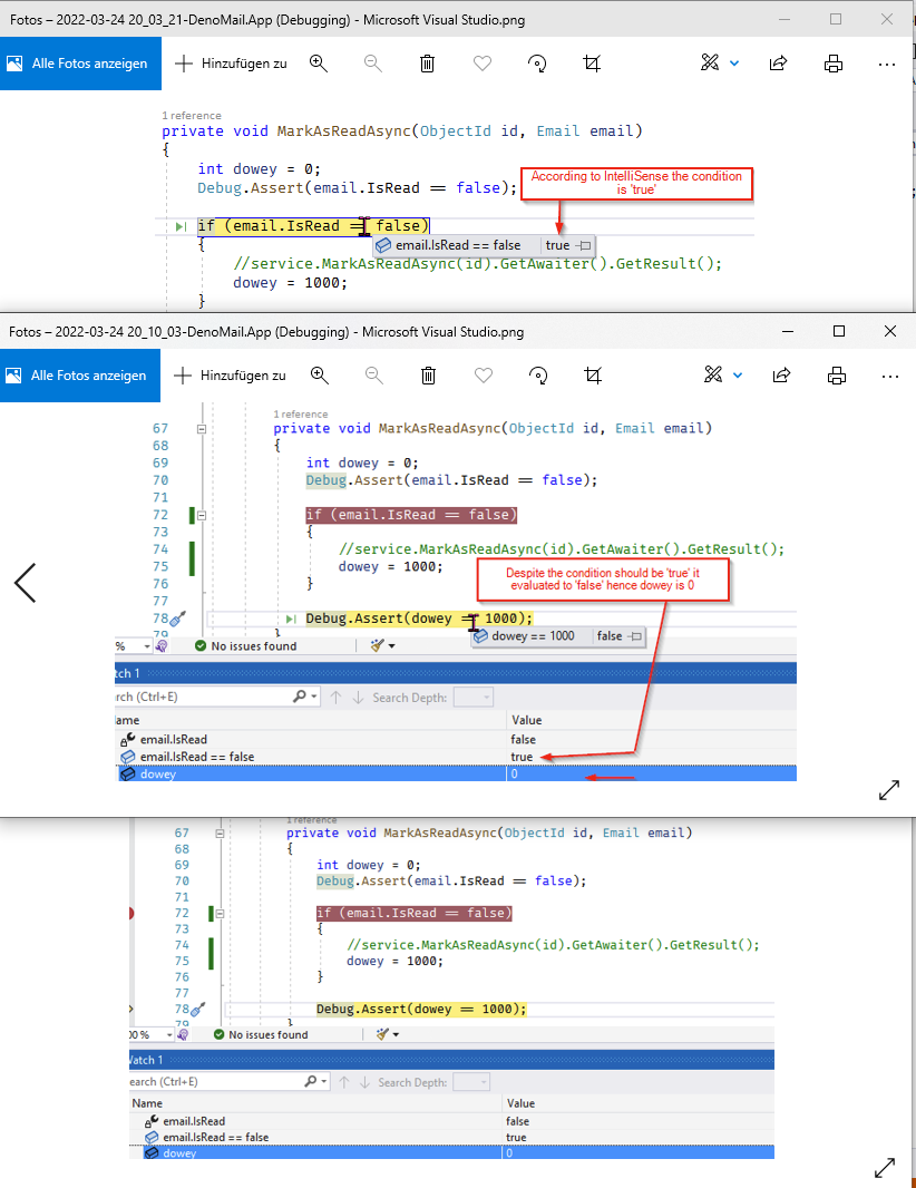 That looks like either an intellisense/debugger issue or something very suspiciously wrong. Can you instead try adding Console.WriteLine statement for email.IsRead at the start of the function.
