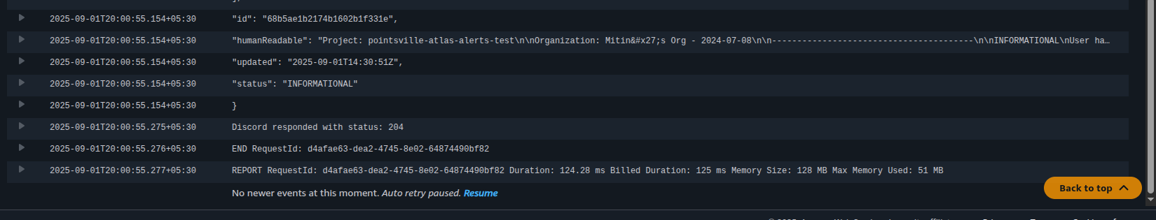 Confirmed webhook payload in CloudWatch (log snippet attached).