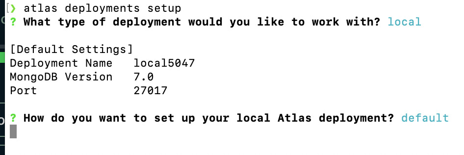 I am following this page to create a local atlas deployment but after running the command atlas deployments setup selecting local and default the command hangs and i see no output.