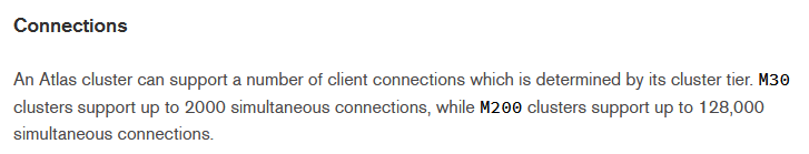 The Connection Limits for Atlas Clusters are from the net.maxIncomingConnections configuration option. Attempting to change wiredTigerConcurrentReadTransactions and wiredTigerConcurrentWriteTransactions server parameters won’t increase the Atlas connection limit. You’ll need to select the cluster tier that matches the connection limit requirement for your application(s).