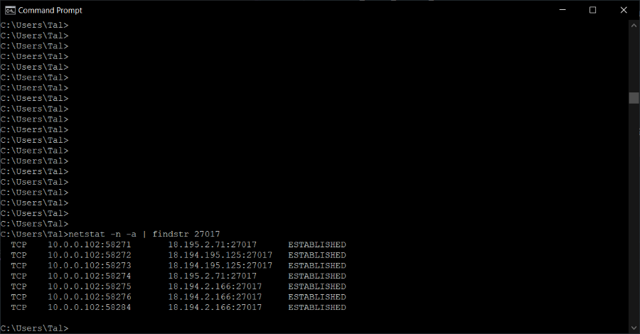 In the screenshot, you can see that the servers in mongodb Atlas that opened the 27017 ports, are opening dynamic ports to our local machine (i.e. 10.0.0.102) that are probably necessary for communication.