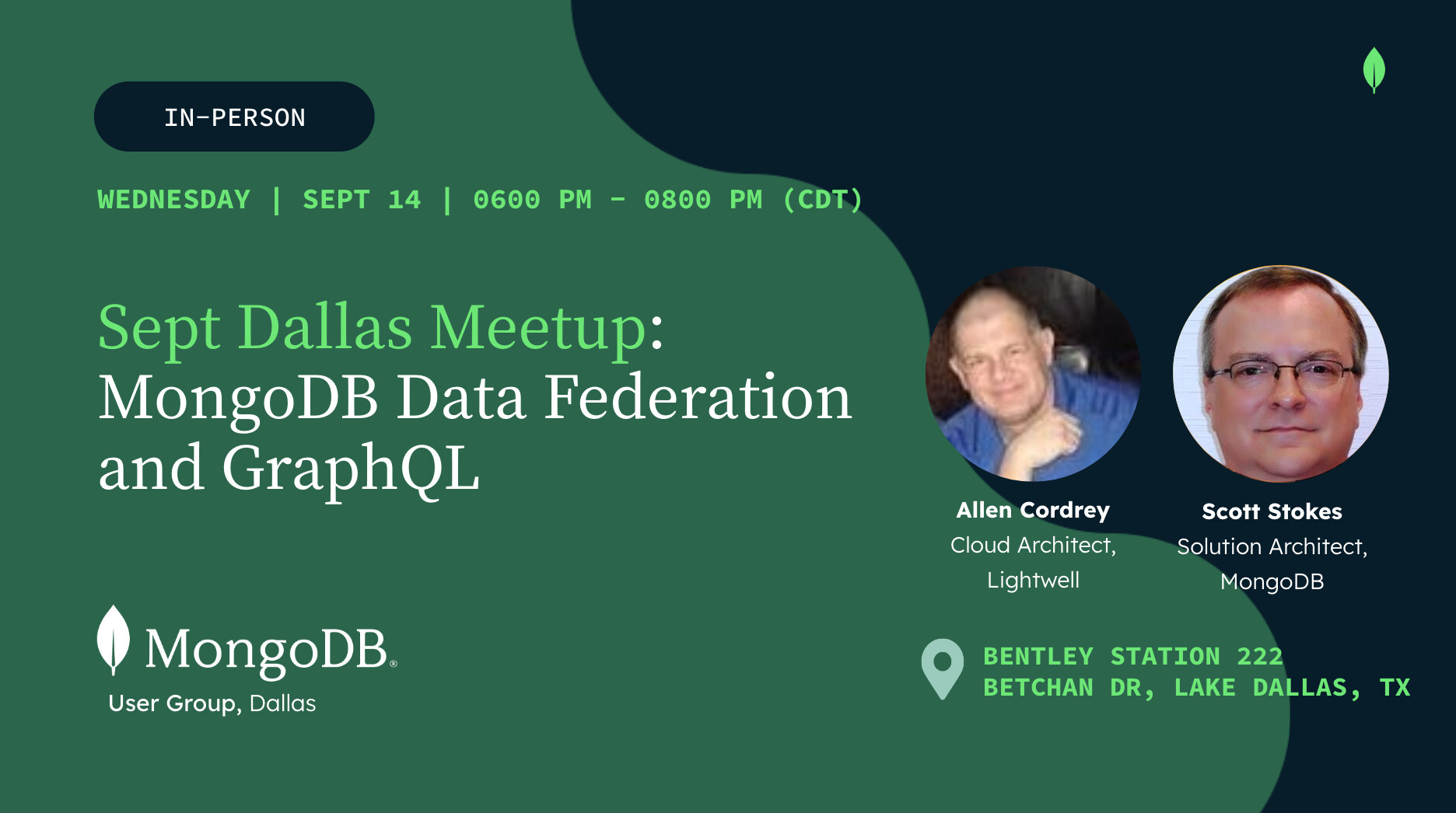 MongoDB Advisory Architect, Scott Stokes will be presenting the latest on Data Federation and GraphQL. We will also have a networking period so you can meet your fellow MongoDB users in the DFW area.