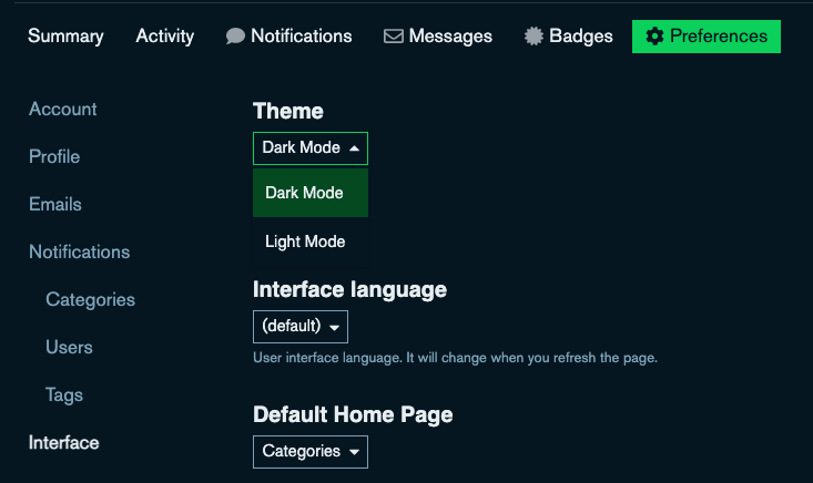 - On the left side of your screen, choose Interface. Then, under the Theme header, select which theme you’d prefer to use. You can change this at any time.
