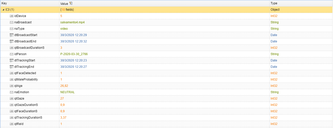 The idea is to check overlapping between broadcasting time (that starts at data.begin and finishes at data.end) and reaction time (that starts at data.Trackings.BeginTime and finishes at data.Trackings.BeginTime + data.Trackings.TrackingDuration) in order to get a table similar to this (just a simple example for one video that provokes three different reactions; ultimate outcome would include also other parameters like Emotion, Age, etc.):