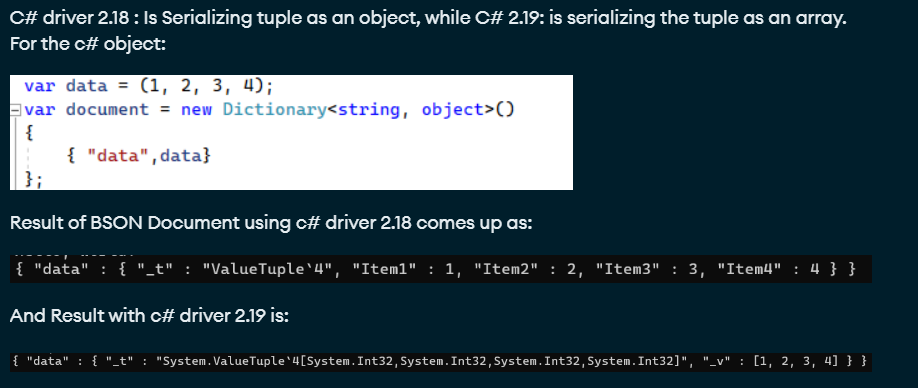 Hey! I recently upgraded the c# driver from 2.18 to 2.19. And Tuple Serialization in both are being done differently. Which is causing issues and bigger problem is these differences I was not able in docs. As per this document on breaking changes introduced in 2.19 for known types only Object Serializer works with tuple being a known type.