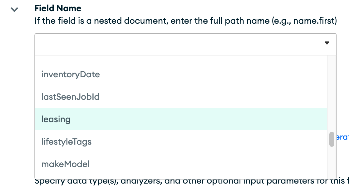When setting up the leasing.regionalPrices in my index with the embeddedDocuments type, I found that the dropdown doesn’t list that field: