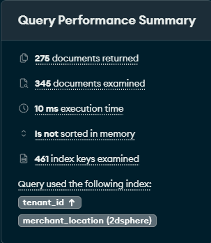 I’m currently working with a collection named “merchants” and I’ve set up a compound index with the following attributes: **(tenant_id(asc), merchant_location(2dsphere))**.