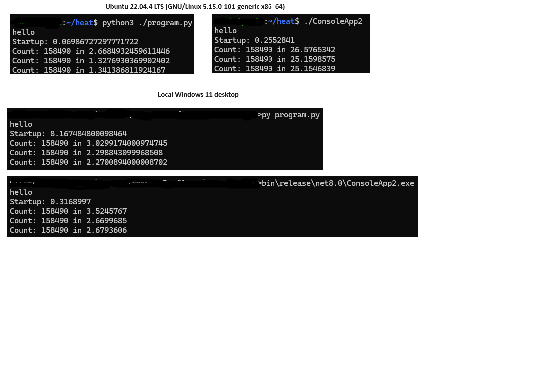 Here’s the results as simple timed console outputs where I run both code sets on windows and linux