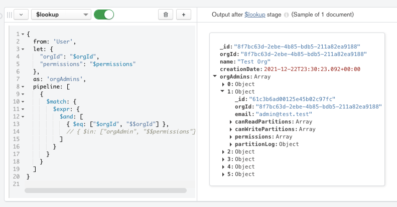 I’m trying to build an aggregation that will do a left join between Organizations and Users, including all organization users that have orgAdmin permissions. Here it is at the moment: