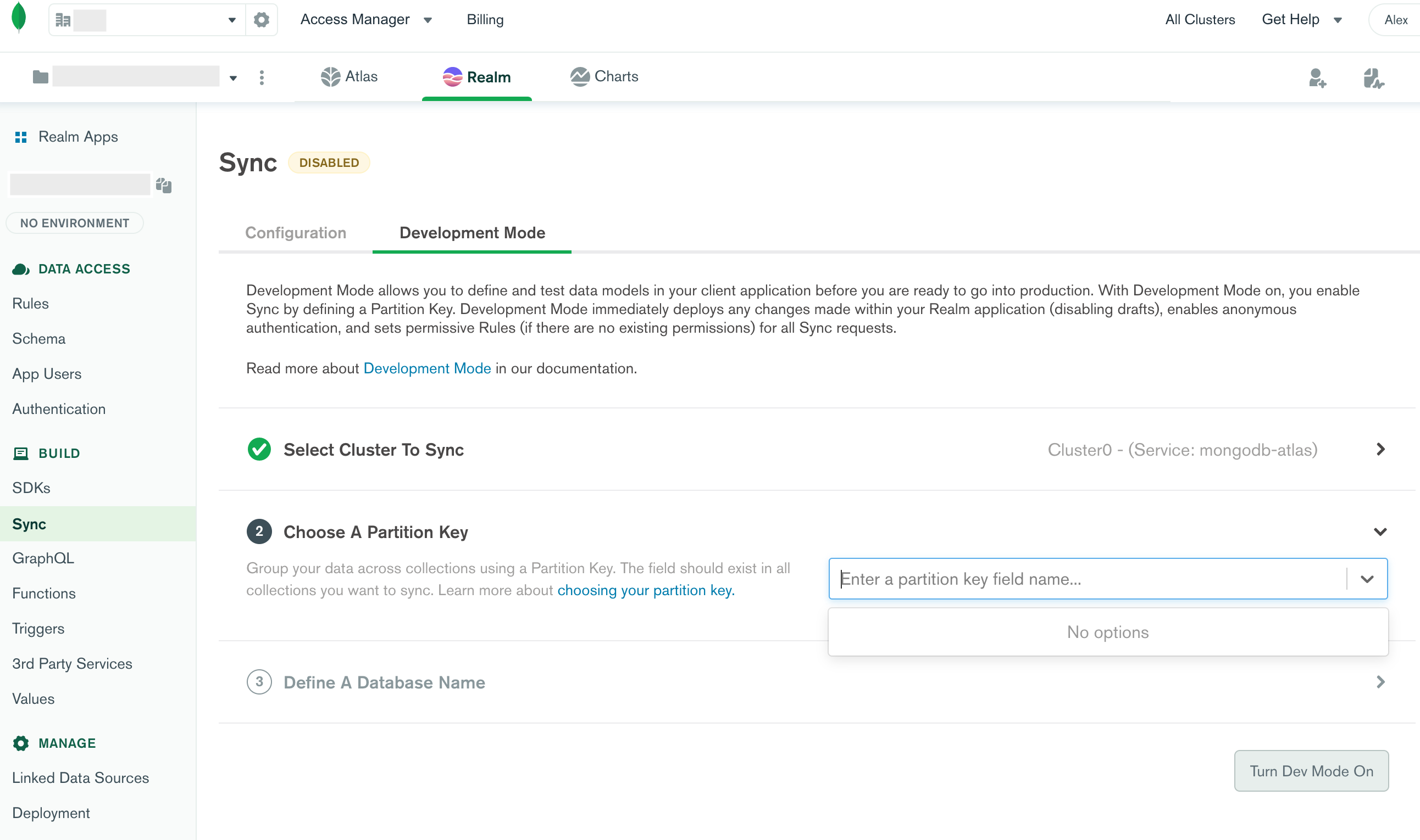 Now I’m trying to make a Synced Realm for my app. I figure I would create a Synced Realm and put it in Development mode from scratch. That way I can convert my existing data into Synced data bit by bit and I don’t have to worry about the server side schema yet. I’m hoping that the schema will be defined for me and I can use it once I’m ready to move to a production level deployment.