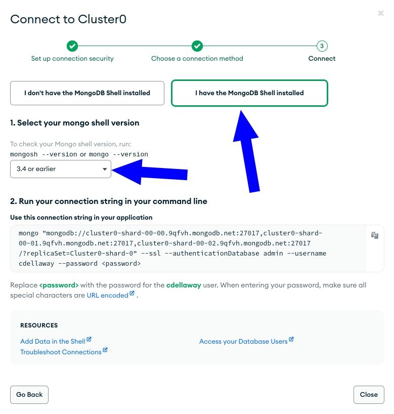 Hi, I am trying to connect to the cloud cluster via mongodb shell, but I get the following error: