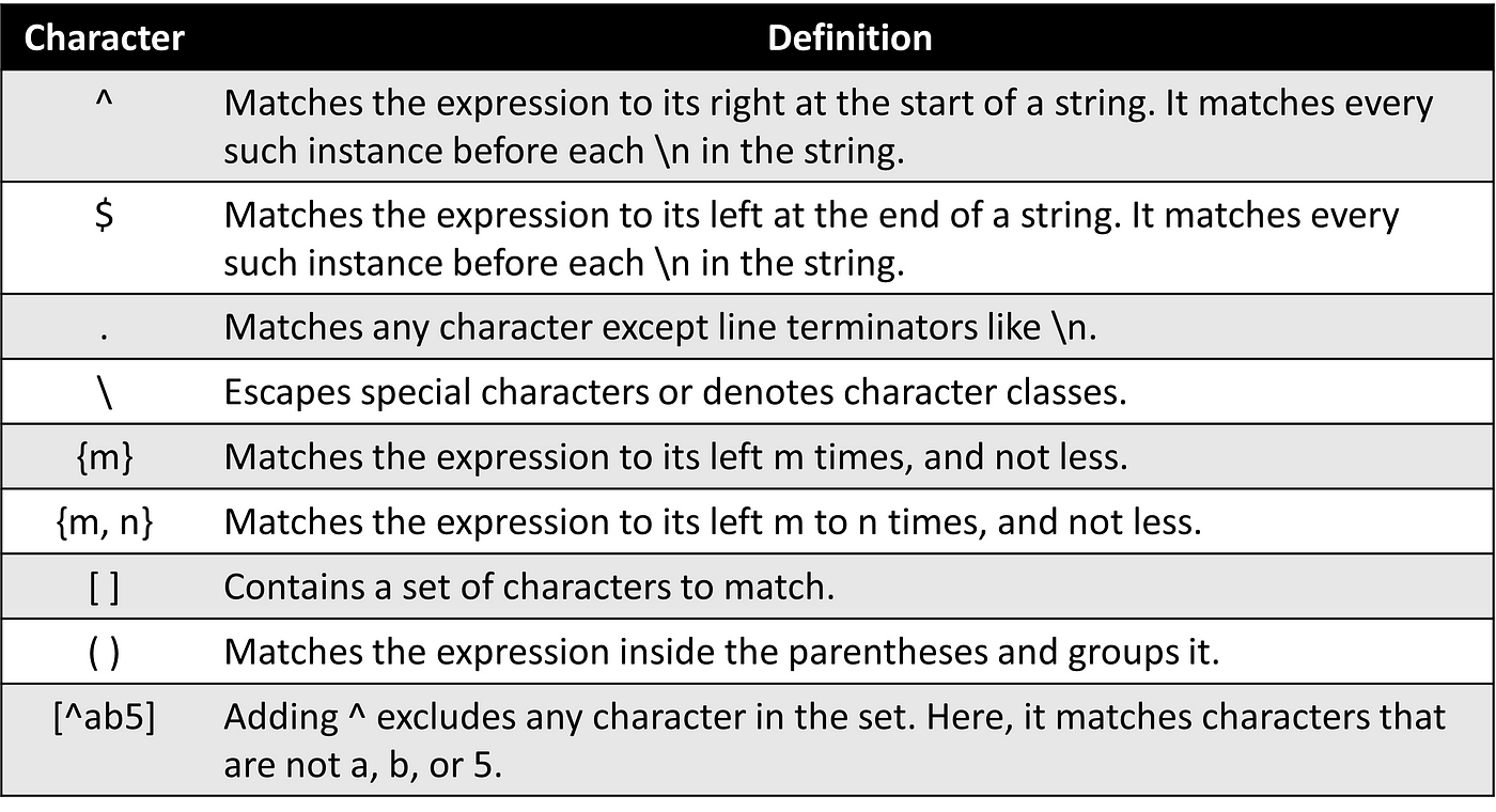 Character class: Matches any of the enclosed characters. You can use a hyphen to indicate range. For example [abc] is equivalent to [a-c] and both match the “b” in the string “boy”.