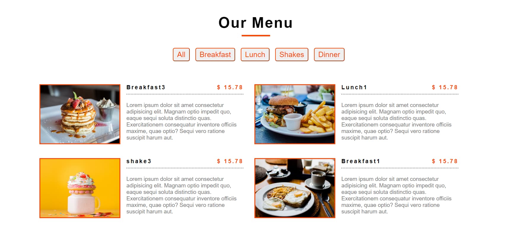 for day 10, I spent my mourning creating a classic restaurant menu website, The website has 5 buttons at the header , each belonging to a category of food. Clicking on a button will show you the food that belongs to this category.