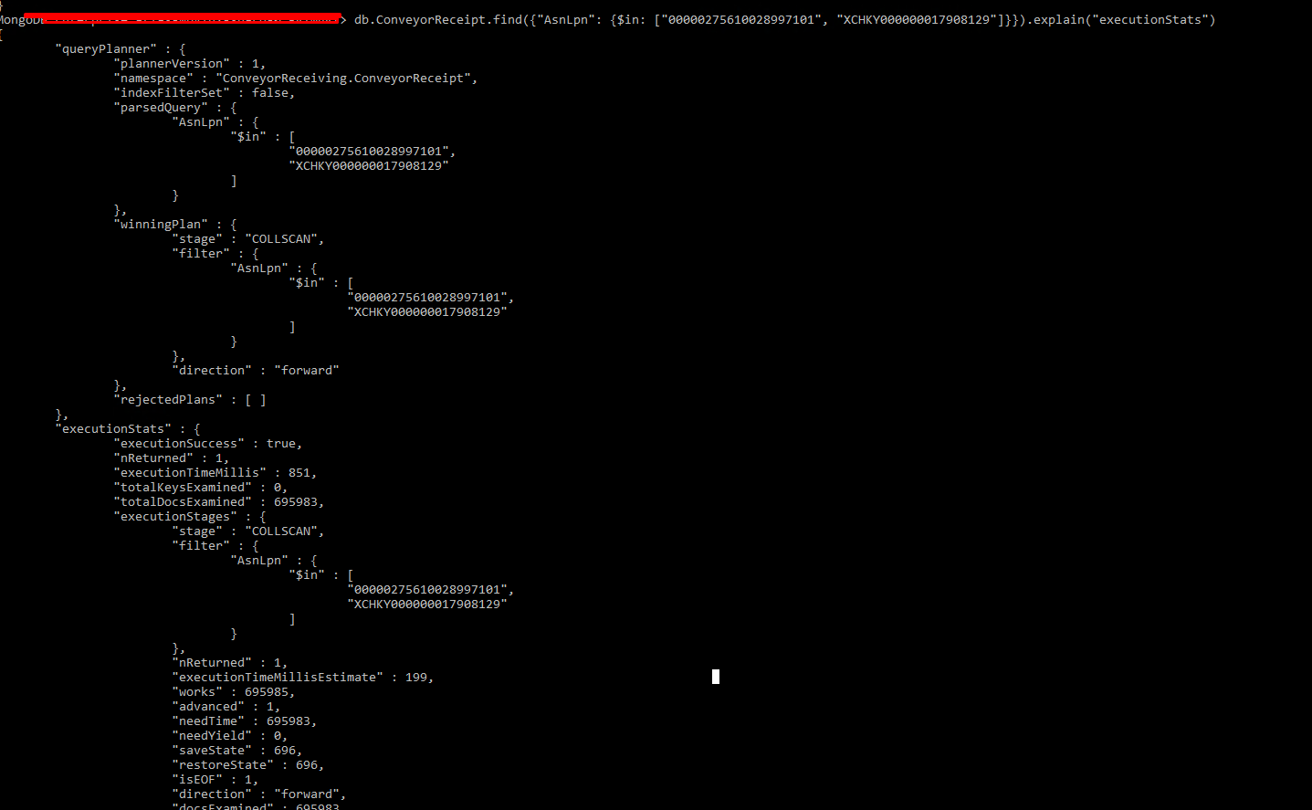 I have an index on the AsnLpn field but for some reason when I use an $IN statement it seems to bypass my index for a COLLSCAN