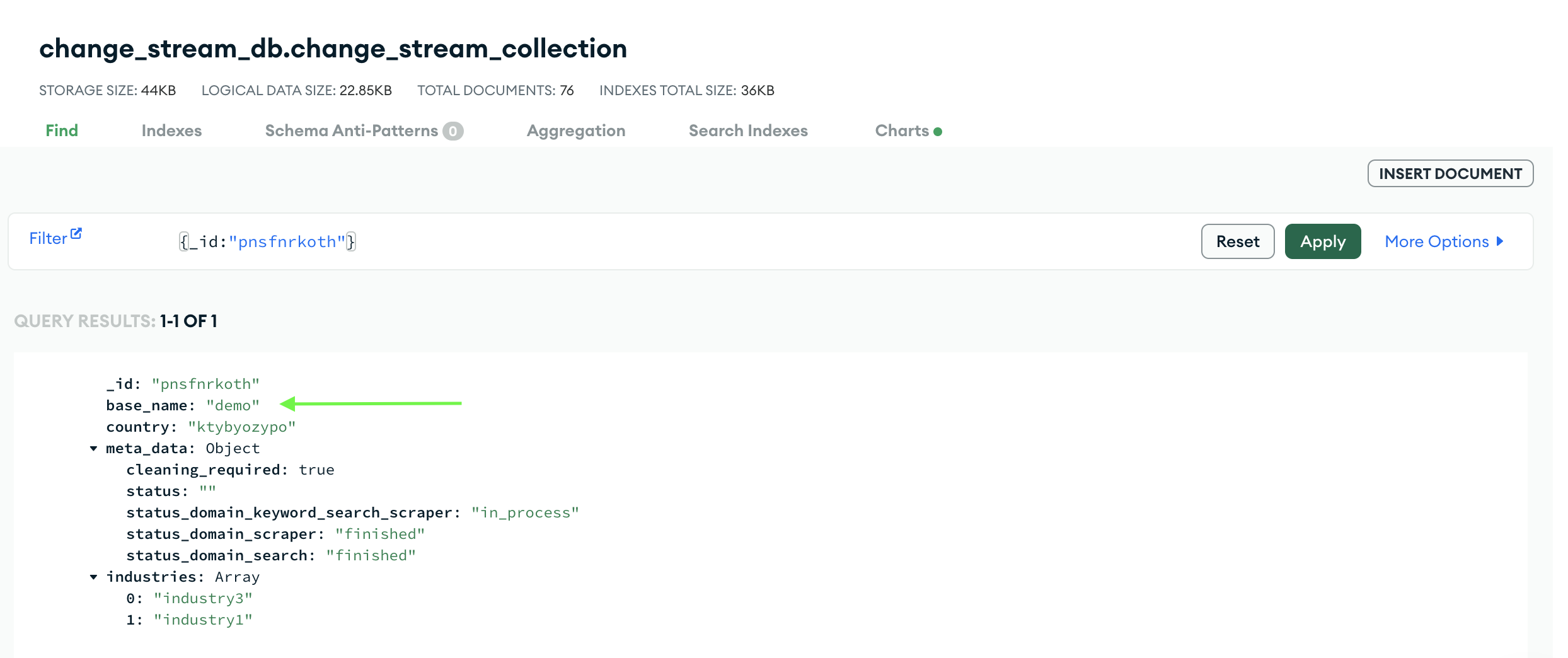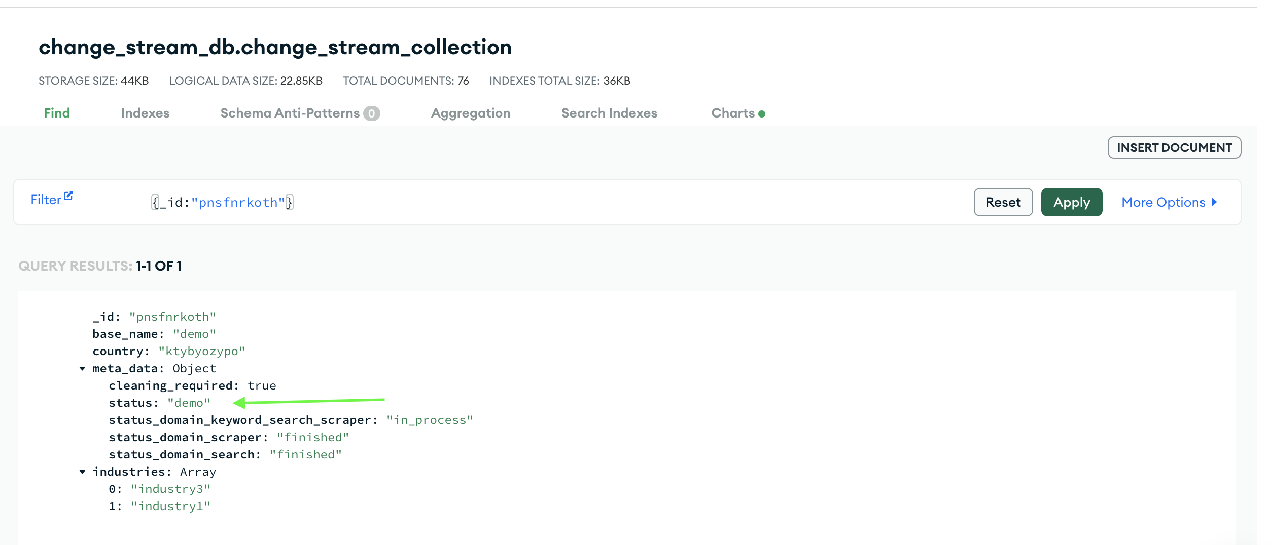 {'_id': {'_data': '826437B02F000000062B022C0100296E5A10048332797CF83843B4B13C30209360370E463C5F6964003C707764686C68666A6F6B000004'}, 'operationType': 'insert', 'clusterTime': Timestamp(1681371183, 6), 'wallTime': datetime.datetime(2023, 4, 13, 7, 33, 3, 69000), 'fullDocument': {'_id': 'pwdhlhfjok', 'base_name': 'zlskzvugui', 'country': 'vebeonoigb', 'meta_data': {'cleaning_required': False, 'status': 'sdm_triggered', 'status_domain_keyword_search_scraper': 'finished', 'status_domain_scraper': 'finished', 'status_domain_search': 'finished'}, 'industries': ['industry2']}, 'ns': {'db': 'change_stream_db', 'coll': 'change_stream_collection'}, 'documentKey': {'_id': 'pwdhlhfjok'}}