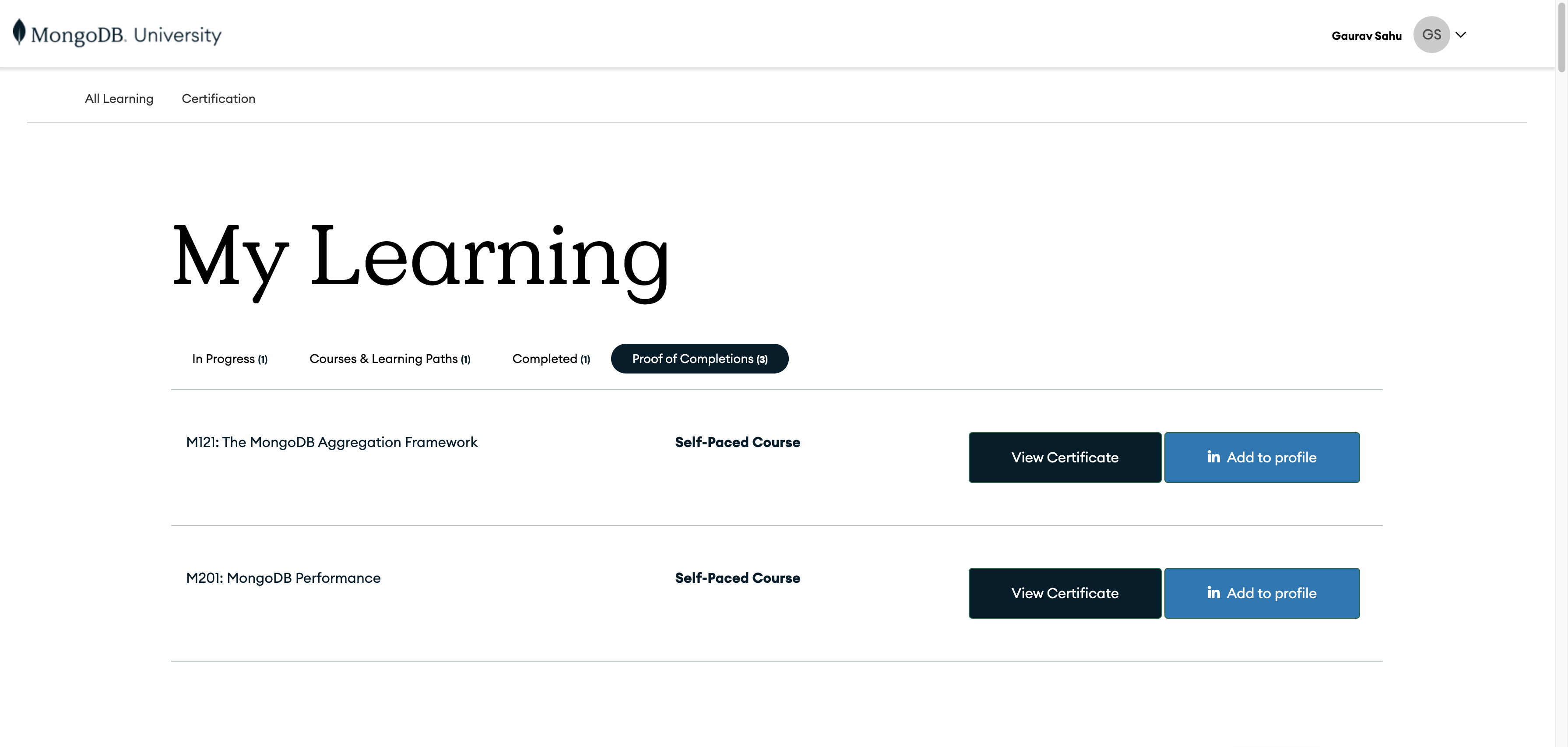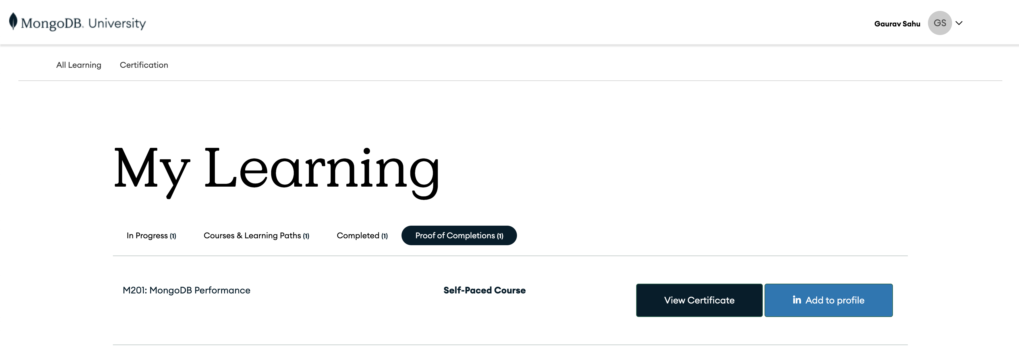 I see only one proof of completion (M201: MongoDB Performance). However, I’ve completed 3 courses (M001, M121 and M201)