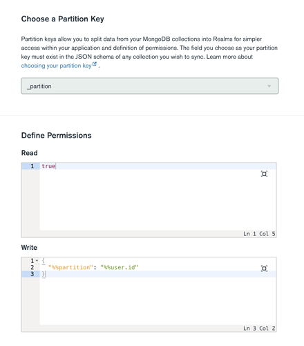 This plays an important role in partition-based Sync. If you have opted for âGenerate Schemaâ in the previous step, you can choose one of the fields from your Schema to split the data across your MongoDB collections into partitions/Realms based on the value. If you opted for Development mode and you are creating your application from scratch, make sure to choose a field that either exists in your client application schema or you create a new one.