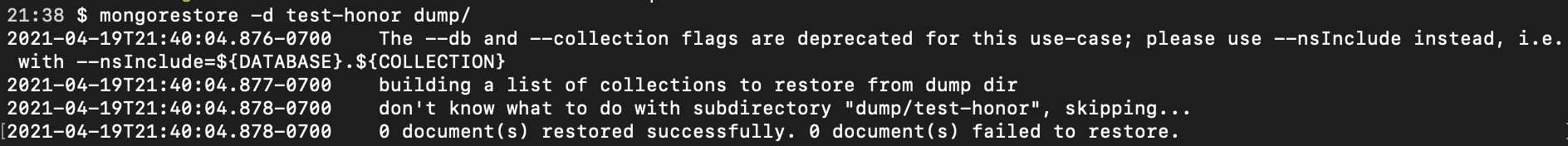 Now we have the following dump and restore commands: mongodump -d test-db mongorestore dump/
