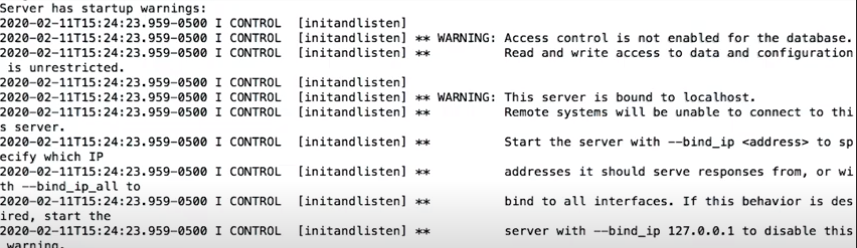 {"t":{"$date":"2020-10-09T01:41:40.080+05:30"},"s":"W", "c":"CONTROL", "id":22120, "ctx":"initandlisten","msg":"Access control is not enabled for the database. Read and write access to data and configuration is unrestricted","tags":["startupWarnings"]}