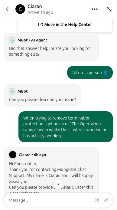 Contact MongoDB support using the chat feature in MongoDB Atlas