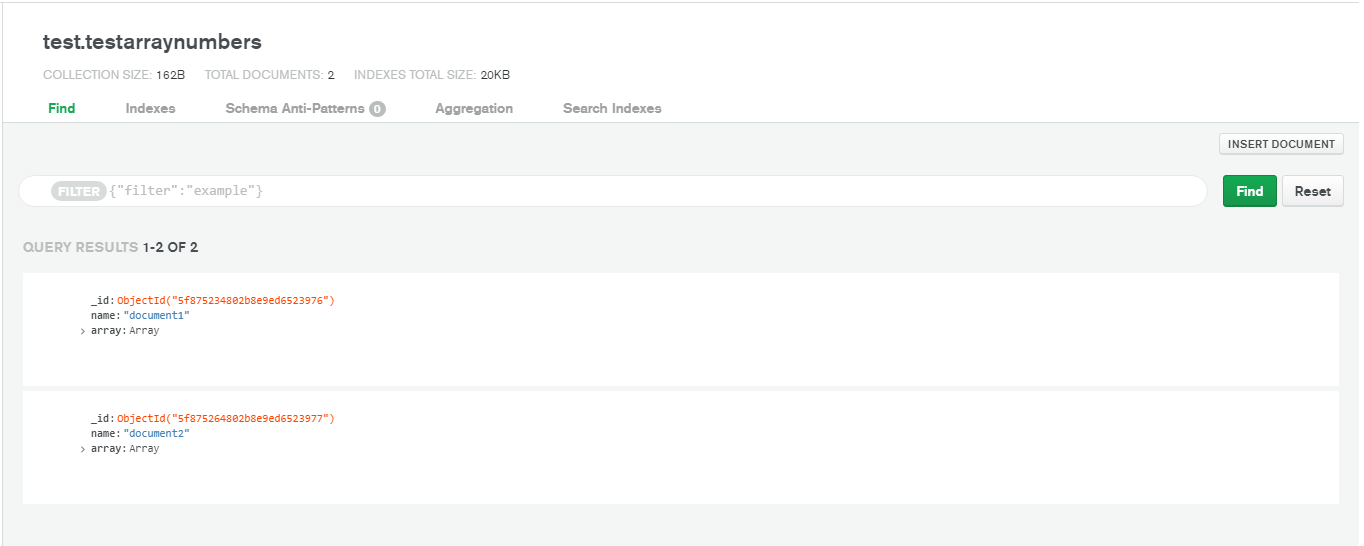 { "_id" : ObjectId("5f84717525fa89f1696c3941"), "array" : [ 1, 2, 3 ] }