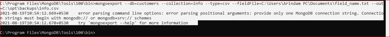 Error: 2021-08-19T14:36:18.090+0530 error parsing command line options: error parsing positional arguments: provide only one MongoDB connection string. Connection strings must begin with mongodb:// or mongodb+srv:// schemes