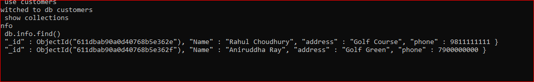 { Name: “Aniruddha Ray”, address: " Golf green", ph: 9811111111 },
