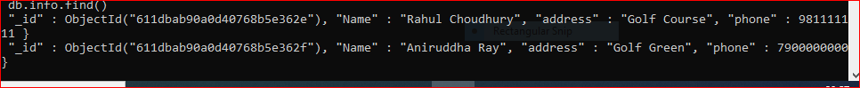 { Name: “Rahul Chiudhury”, address: “Golf course”, ph: 7922222222 }