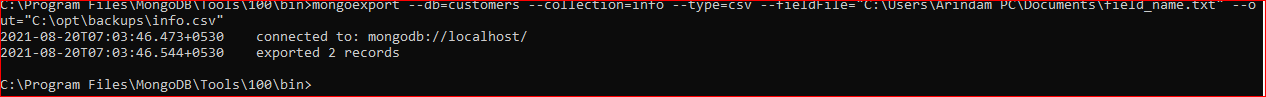 mongoexport - - db=customers - - collection=info - -type=csv - -fieldFile=C:\Users\Arindam PC\Documents\field_name.txt - -out=C:\opt\backups\info.csv