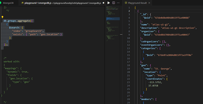 II was using MongoDb Compass for development and have been successfully using $geoNear and $geoWithin for the past few months. I am now using Atlas Free Tier, testing and having some issues returning data with ‘near’ inside $search.