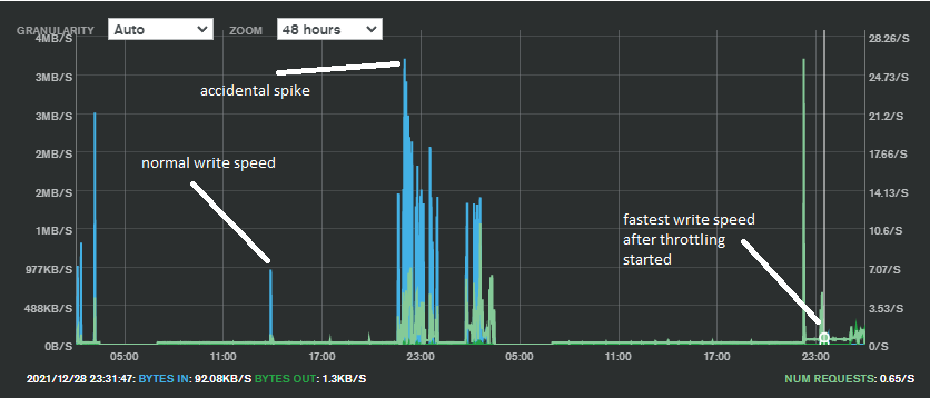 I have been experimenting a little bit with mongoDB recently. For a program I am experimenting with I need to achieve write speeds of about 1mb per second for it to be usable. This was working fine until about 24 hours ago I sent a huge amount of data to my server very quickly (about 3.75mb per second) because of a bug in my code. This caused the network speed to throttle, as expected since I am using the free tier. However, a day later I still can not reach write speeds of above 100kbs. I am very confused as to why this is happening and would appreciate any advice or explanations.