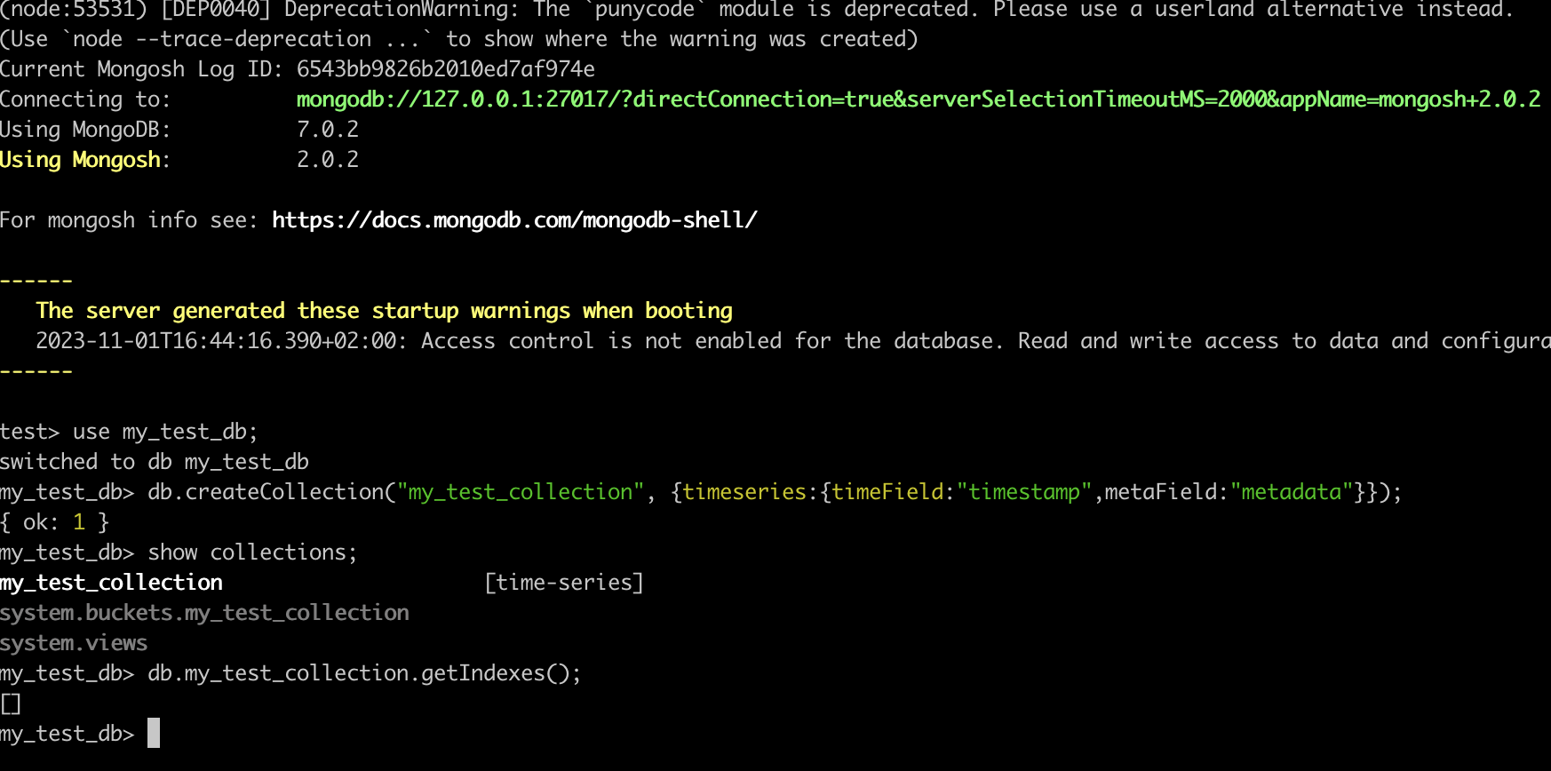 db.createCollection("my_test_collection", {timeseries:{timeField:"timestamp",metaField:"metadata"}});