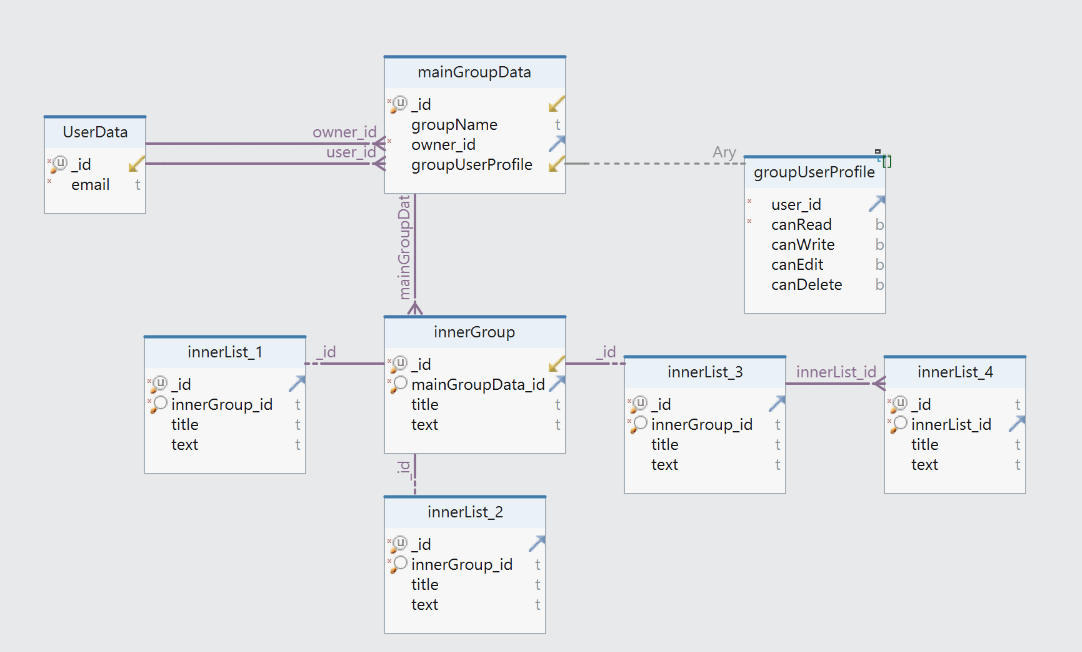 Also, not sure how can get permission for user to read/write documents on (innerList_x) as each will reference the _id of (innerGroup) which is assigned to! Same for (innerList_4) and (innerGroup) which reference (mainGroupData) id.