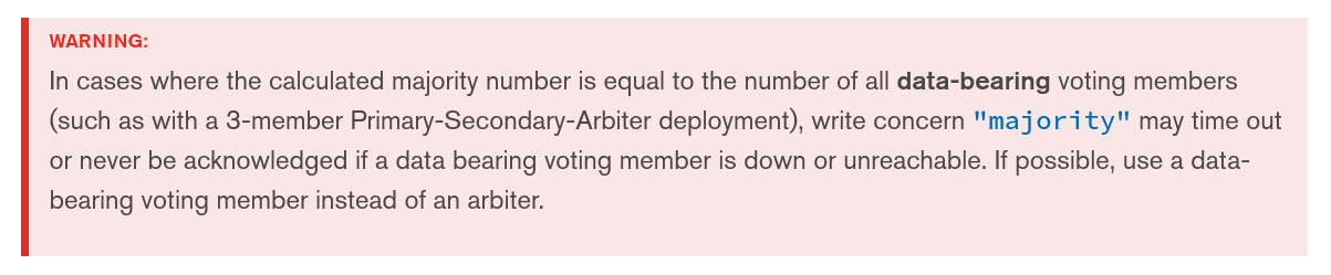 Also, because majority = 3, it means that you won’t be able to elect a primary if 3 nodes are down. So for example if your 3 arbiters are down, you will be stuck with 2 secondaries that are not able to elect a primary. This would not happen if you had only one arbiter because the majority would be at 2 so they would be able to elect a primary.
