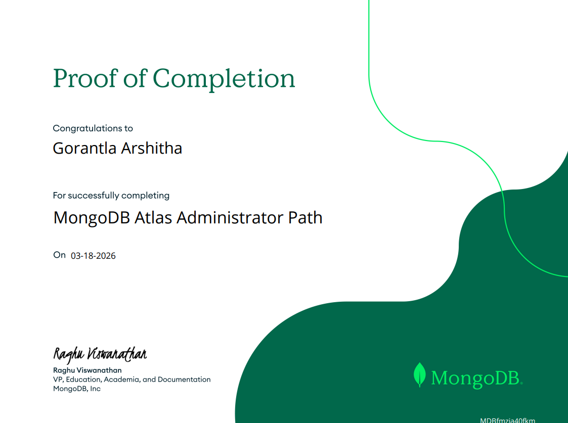 - Course Completed: MongoDB Atlas Administrator Path