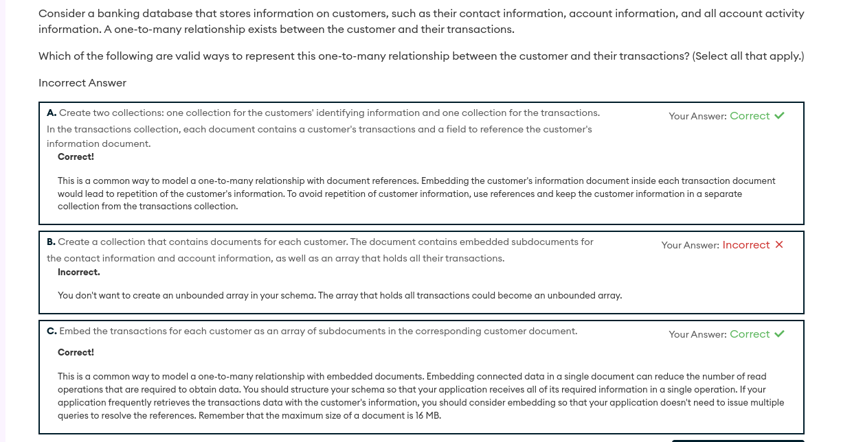 It’s a little unclear what they’re trying to say in B … not terribly well written … but I believe they’re describing a messy antipattern where you create a document for each customer, with subdocuments for various customer information, then an array of transactions without a subdocument structure to each transaction.
