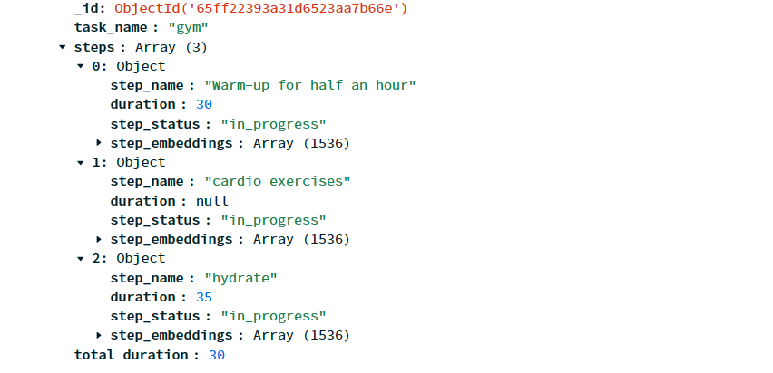 For each document in this collection, I have fields as such where the number of steps is varying, so the length of the array of the steps field varies as well, as it’s shown in the picture, that I want to have embeddings for each of the step name separately. For the part of making the search index and then attaching it to the step_embeddings ,
