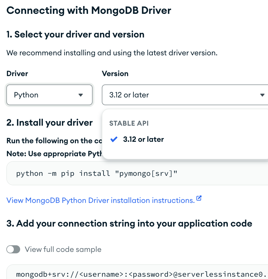 I am trying to do this, but all I see is mongodb+srv suggested. Can you give me more details on what you mean by the “choose your driver” dropdown? All see is the below screenshot, and it doesn’t mention a pymongo version