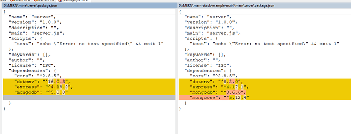 I am following the MongoDB MERN tutorial and when my front-end tries to connect to the DB to pull documents it errors out. I have pulled the official version of their GitHub repo and added my connection information and it works properly with theirs. The only differences I can find is theirs uses mongoose, which the tutorial doesn’t reference, and the versions of the packages are older.