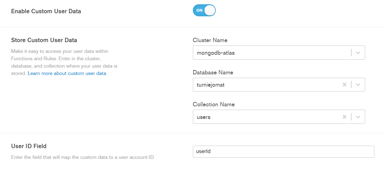 In the Users section of Mongo Stitch panel I enabled custom data. I chose database, collection ( users ) and stated User ID Field to be userId . Then I deployed changes.