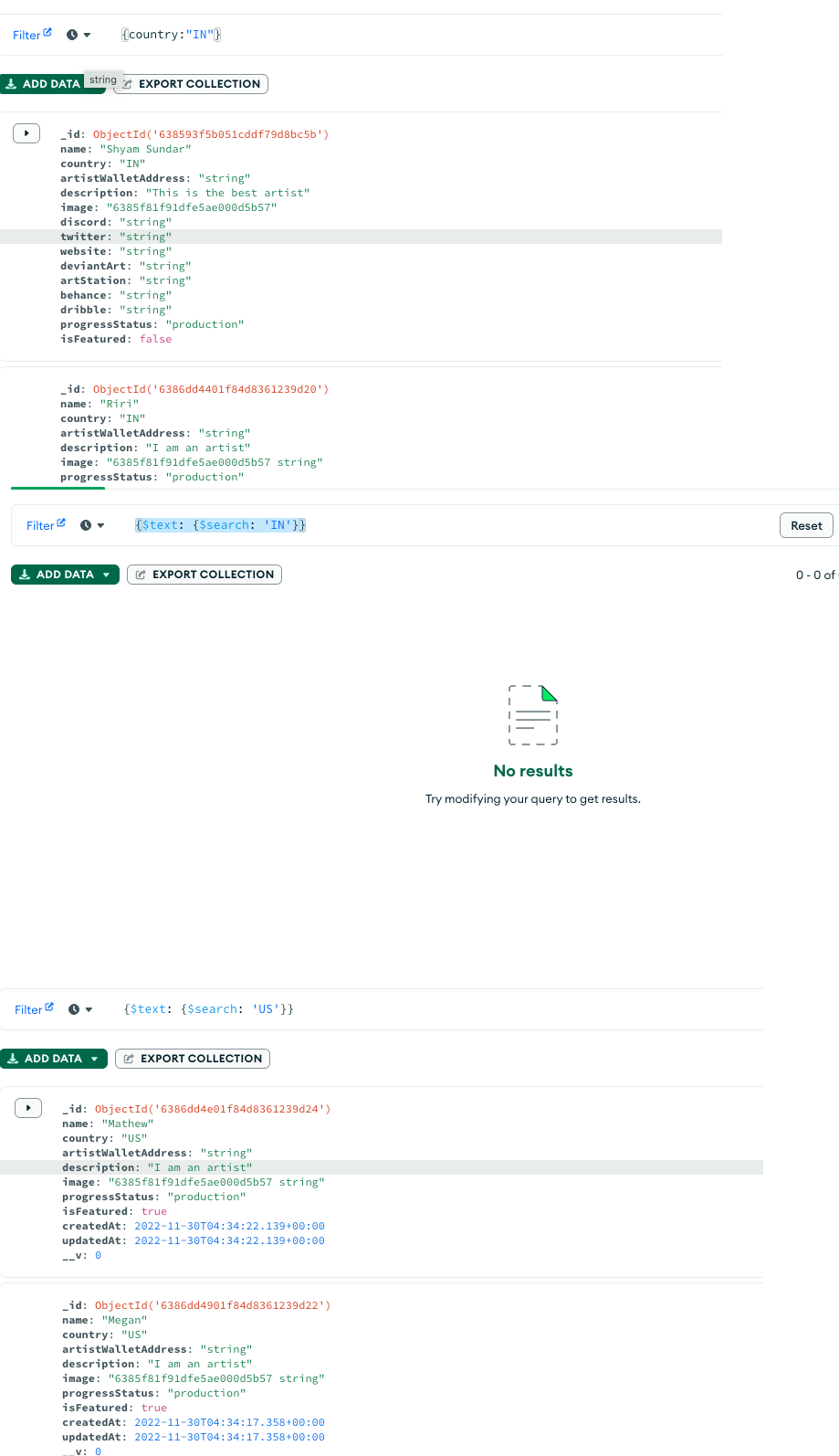 Hey guys, I am currently blocked in a weird situation, I am using full text search for a backend module I am currently building where I faced this issue. Whenever I am trying to query via country naming code like US for United States, IN for India, etc. The search query for {$text: {$search: 'IN'}} was not returning any data but there was data stored inside the database, even if I change the input of the query to US from IN {$text: {$search: 'US'}} the query works. And the problem is whenever I am trying to query 'country':'IN', I am receiving output. These are the 3 types of output for anyone who might be interested in helping me out here.