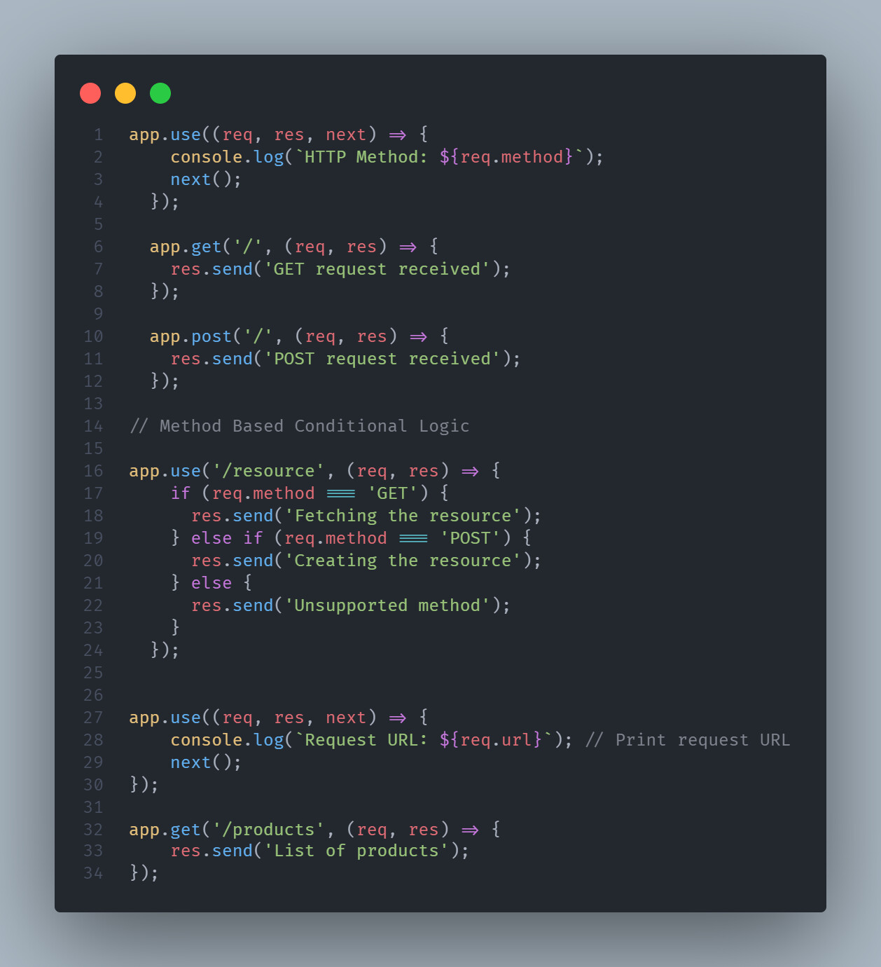 Usage : Useful for determining how the request should be handled based on the method used. This can be especially important in middleware or route handlers that need to perform different actions depending on the method.